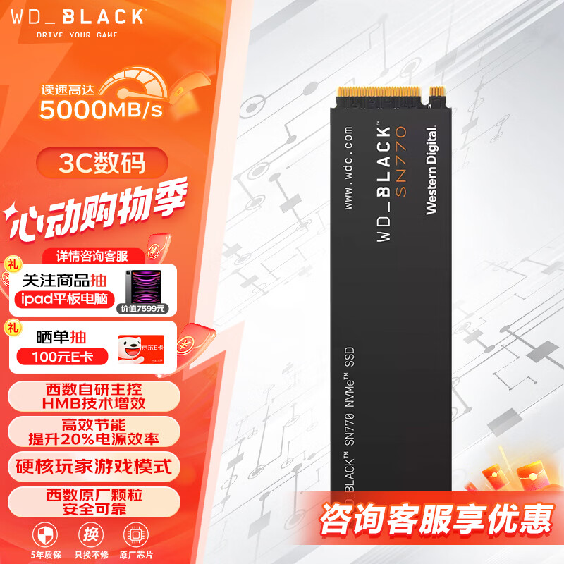 西部数据(WD)500G SSD固态硬盘 M.2接口 SN770 PCIe4.0 2280(NVMe协议)AI电脑配件 笔记本电脑游戏硬盘价格:419.00元!