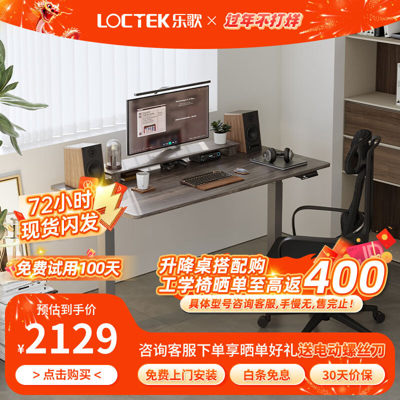 乐歌电动升降桌电脑桌双电机站立办公家用书桌 E3/1.8m灰胡桃木色套装价格:2339.00元!