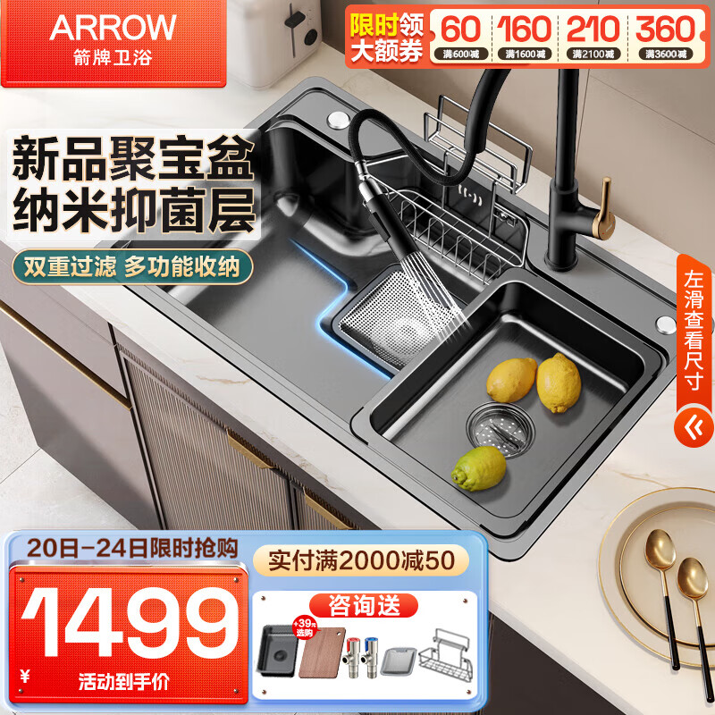 箭牌(ARROW)水槽聚宝盆304不锈钢一体洗菜盆加厚日式下收纳大单槽家用洗碗池 75*48多功能纳米单槽-配黑金龙头价格:1909.00元!