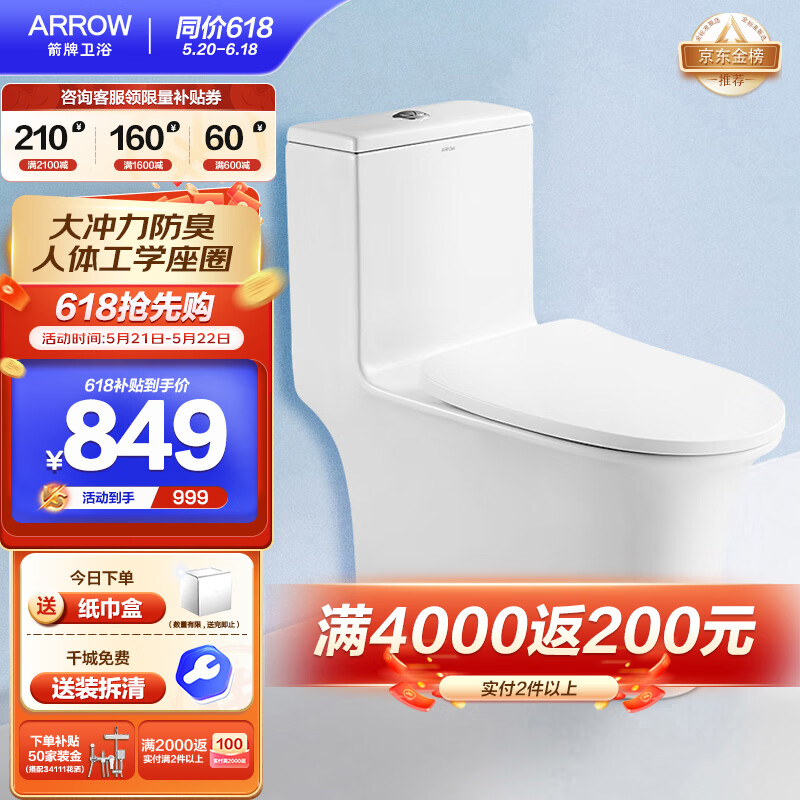 箭牌(ARROW)抽水马桶家用卫浴虹吸坐便器普通座便节水坐厕 1级水效AEB12617L价格:1069.00元!