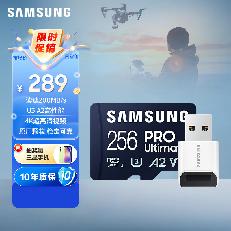 三星(SAMSUNG)256GB TF(MicroSD)U3 V30 A2读速200MB/S 4K 高速视频内存卡套装价格:289.00元!