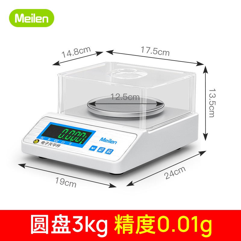 Meilen 电子天平0.01g0.001g高精度电子秤克称天平秤中药黄金珠宝秤实验室分析 圆盘-量程3000g-精度0.01g-配防风罩砝码价格:429.00元!