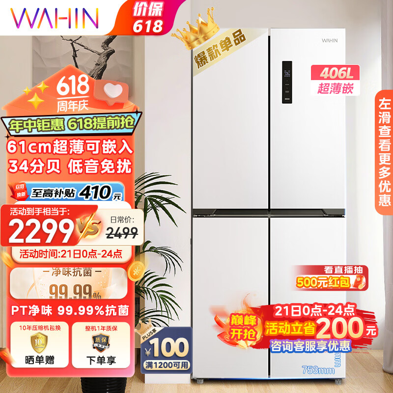 华凌61cm薄406升十字双开门四门多门大容量家用智能白色低音一级能效电冰箱BCD-406WSPZH超薄可嵌入价格:2499.00元!