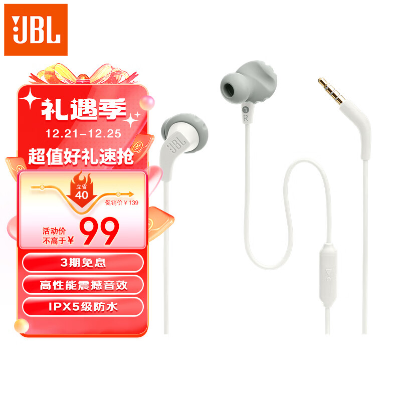 JBL Run2 入耳式有线耳机 跑步骑行运动耳机 3,5mm线控带耳麦电脑笔记本电竞游戏吃鸡K歌专用 白色价格:99.00元!