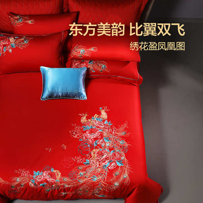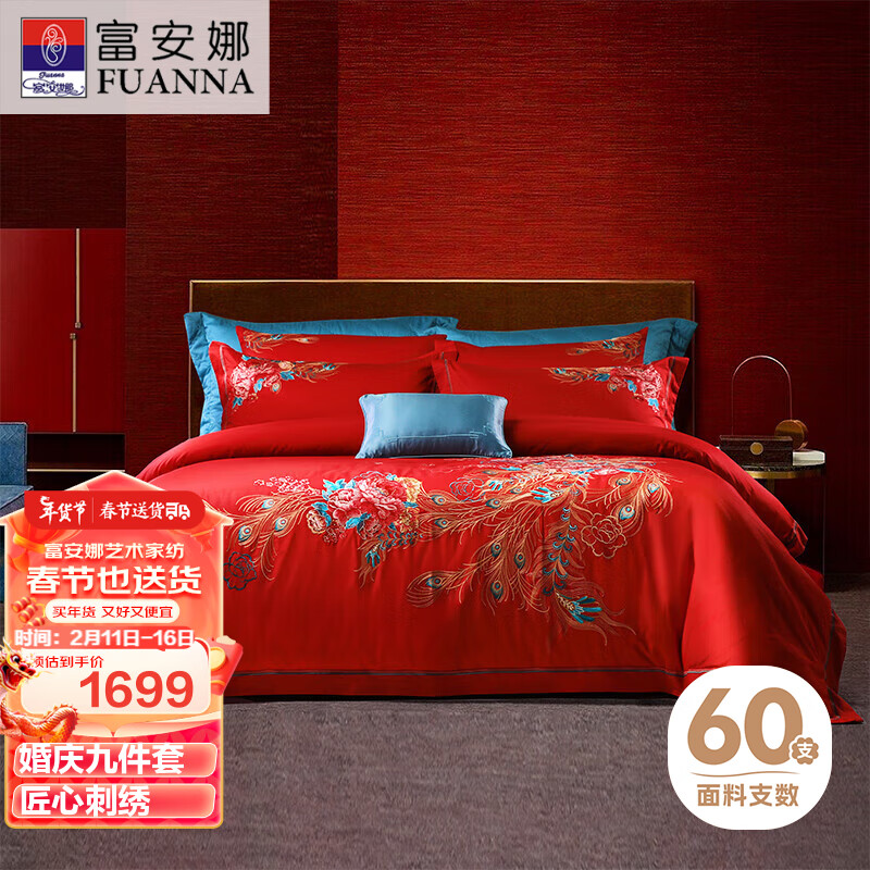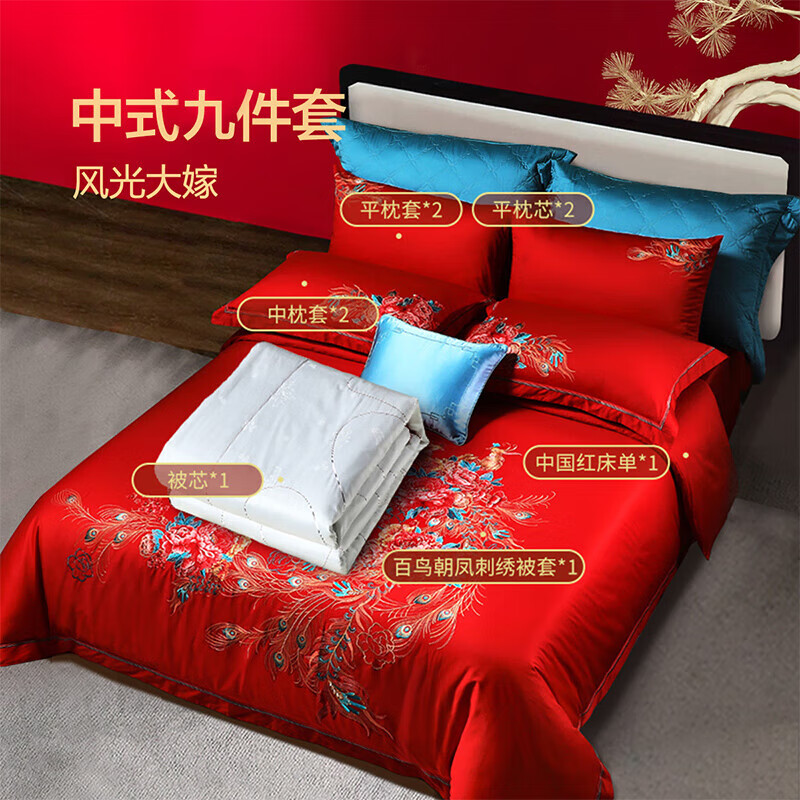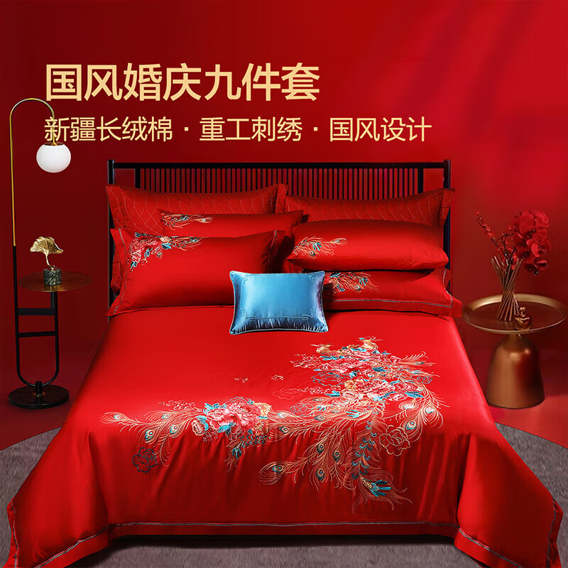 富安娜结婚床上用品九件套纯棉?60s全棉刺绣红色被套喜被枕头203*229cm价格:2199.00元!