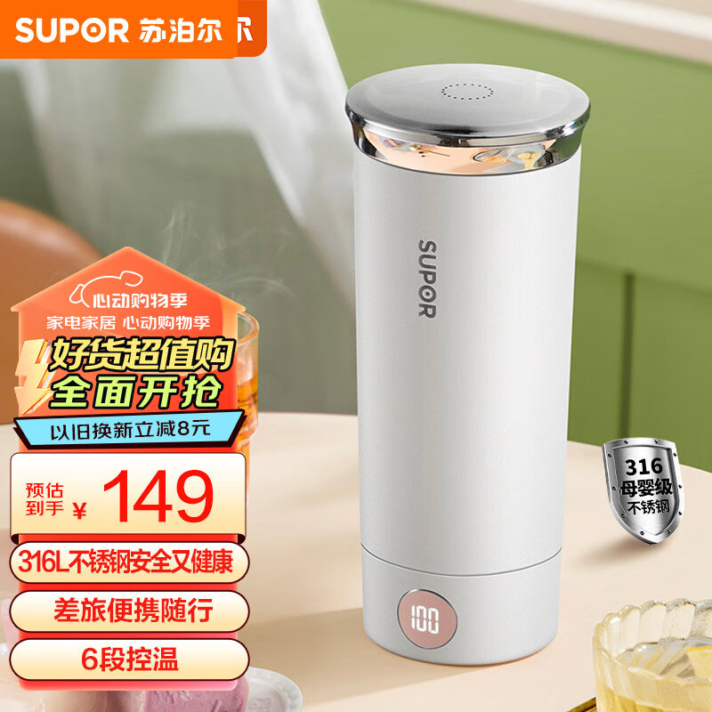 苏泊尔(SUPOR)电热水杯 随行烧水杯 便携式保温烧水壶316不锈钢 旅行冲奶泡茶办公室养生电水壶SW-03T01A价格:149.00元!