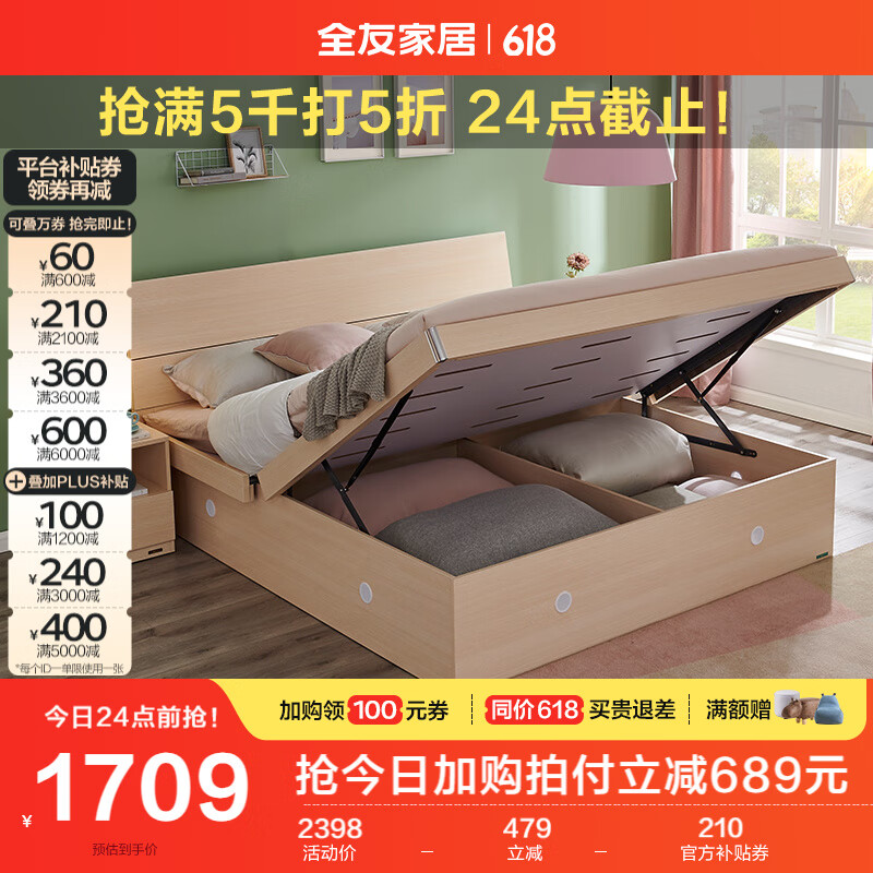 全友家居 双人床高箱储物床板式床现代简约主卧室床1.8x2米家具106302价格:2398.75元!