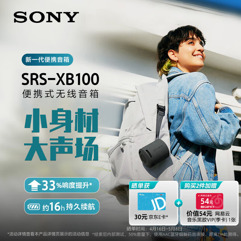 索尼(SONY)SRS-XB100 蓝牙音箱 迷你便携 重低音16小时续航 户外音箱 IP67防水防尘 黑色价格:399.00元!