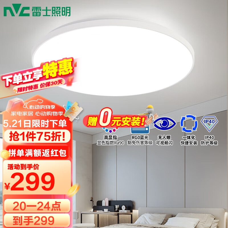 雷士(NVC)LED吸顶灯现代简约卧室书房餐厅灯Ra90高显色IP40防护 如玉36w价格:398.00元!
