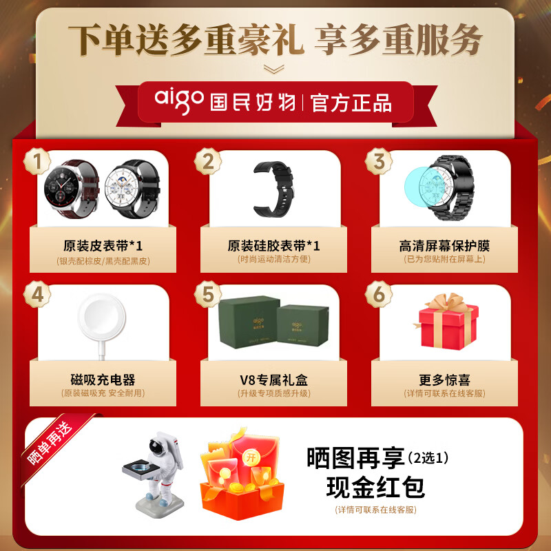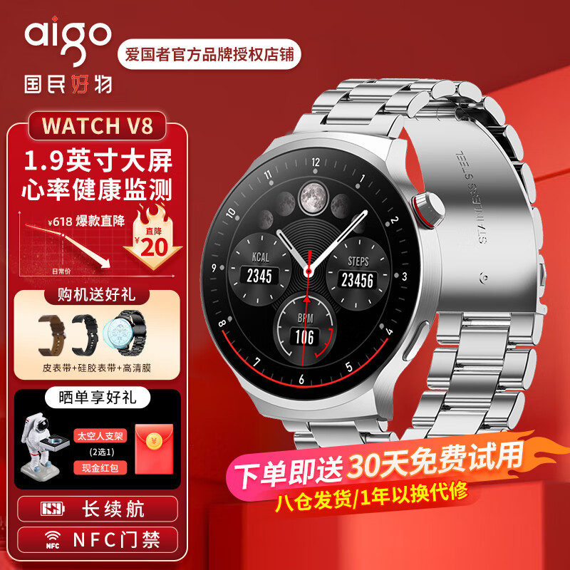 爱国者V8智能手表测心率血压血氧成人男士多功能通话圆盘运动手表送礼 V8银色【配 3款表带】价格:518.00元!