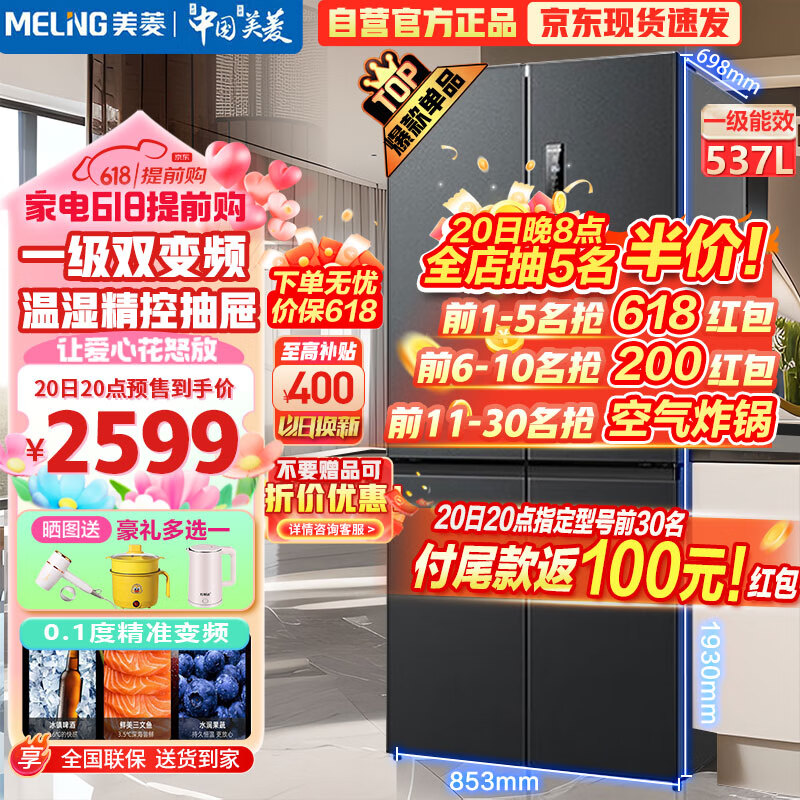 美菱(MeiLing)537升冰箱四开门十字对开门一级能效双变频风冷无霜净味保鲜大容量家用电冰箱 BCD-537WP9CX价格:3099.00元!