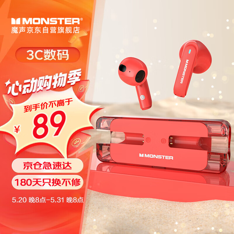 魔声(Monster) XKT08蓝牙耳机真无线智能降噪潮流外观半入耳式耳机通用华为苹果小米手机 红色价格:119.00元!