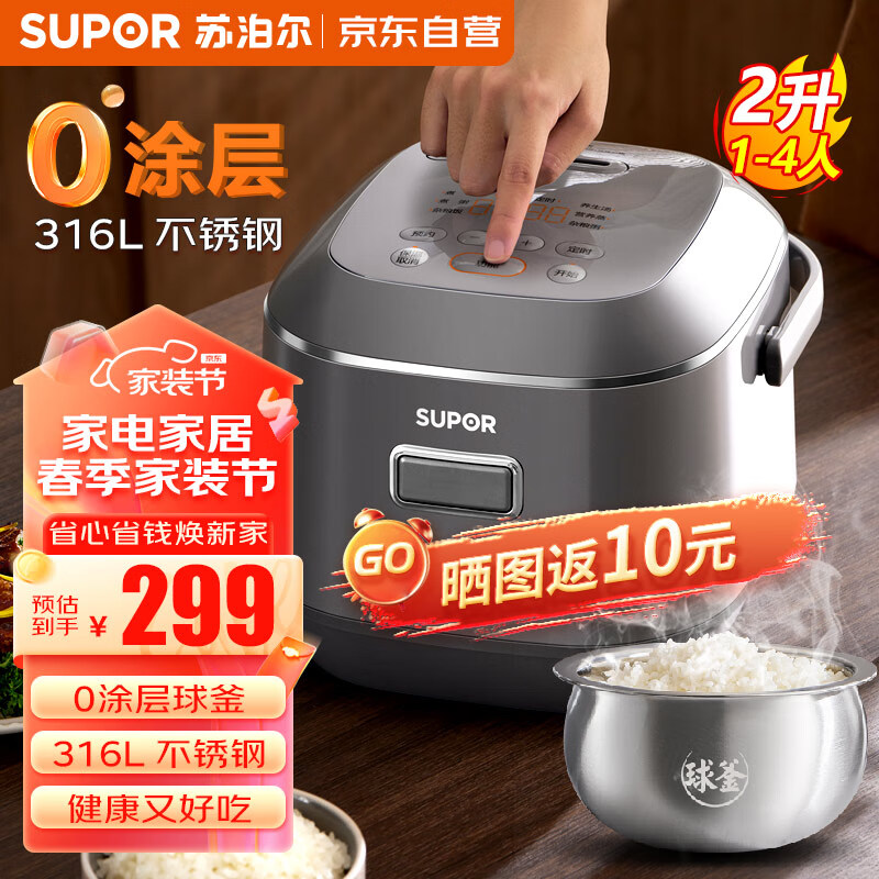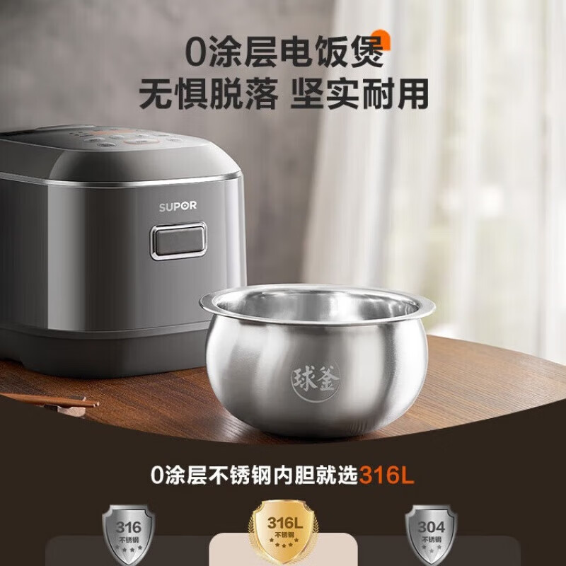 苏泊尔电饭煲 0涂层2L球釜内胆1-2-3-4个人电饭锅 316L不锈钢 大火力家用智能多功能无涂层电饭煲价格:299.00元!