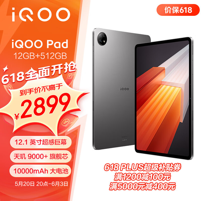 iQOO Pad 12.1英寸平板电脑(天玑9000+旗舰芯 12GB+512GB 144Hz超感巨幕 10000mAh电池)星际灰价格:2899.00元!