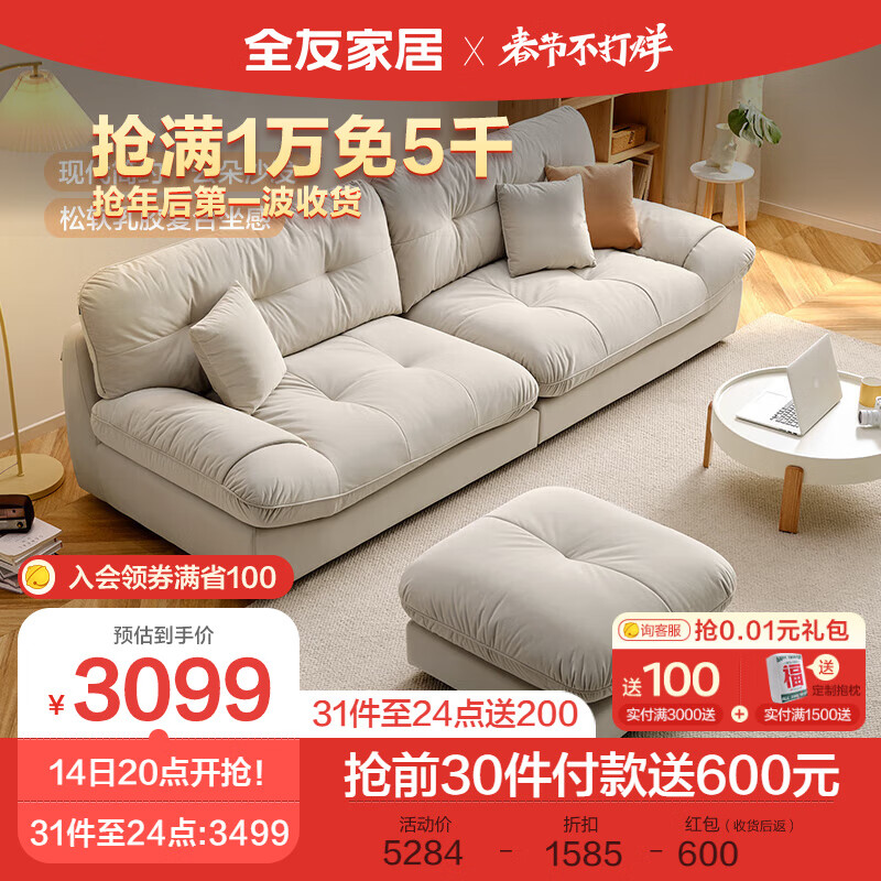 全友家居 奶油风布艺沙发客厅乳胶座包防猫爪绒布云朵沙发座具111039价格:5284.29元!