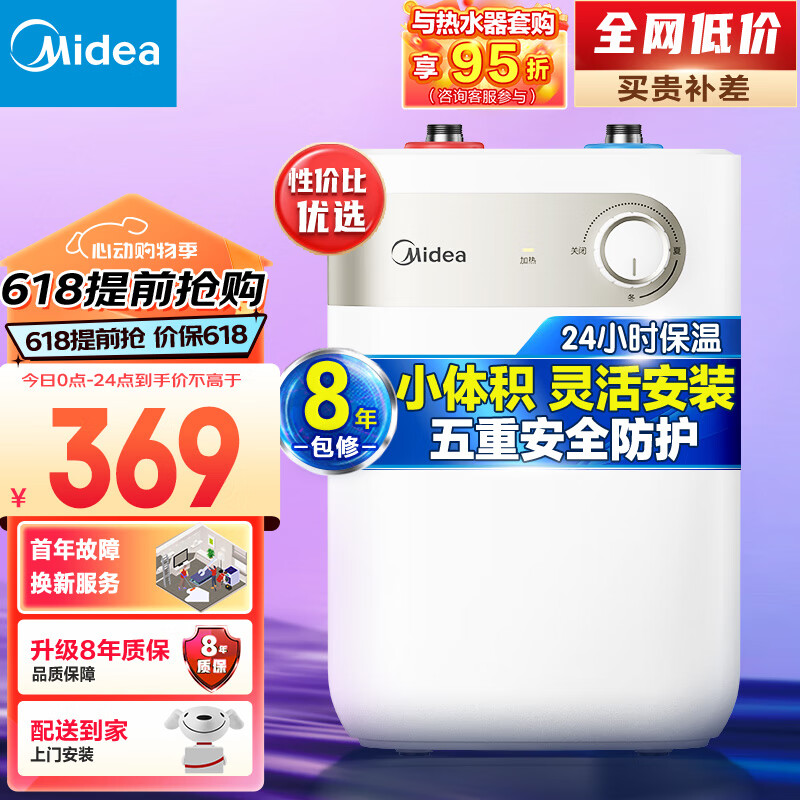 美的(Midea)5升迷你上出水电热水器小厨宝家用蓝钻内胆防护小体积不占地小户型1650W速热 F05-15A1(S)价格:369.00元!