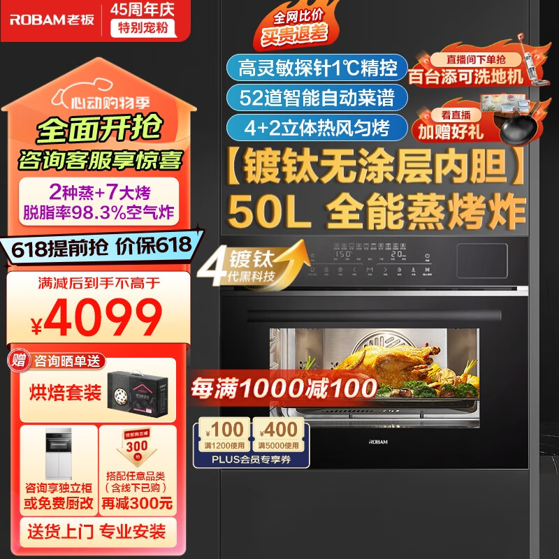 老板(Robam)CQ976D蒸烤箱一体机嵌入式50L家用全能蒸烤炸3合1蒸箱烤箱空气炸专业1℃精控三重自清洁釉感自净价格:4499.00元!