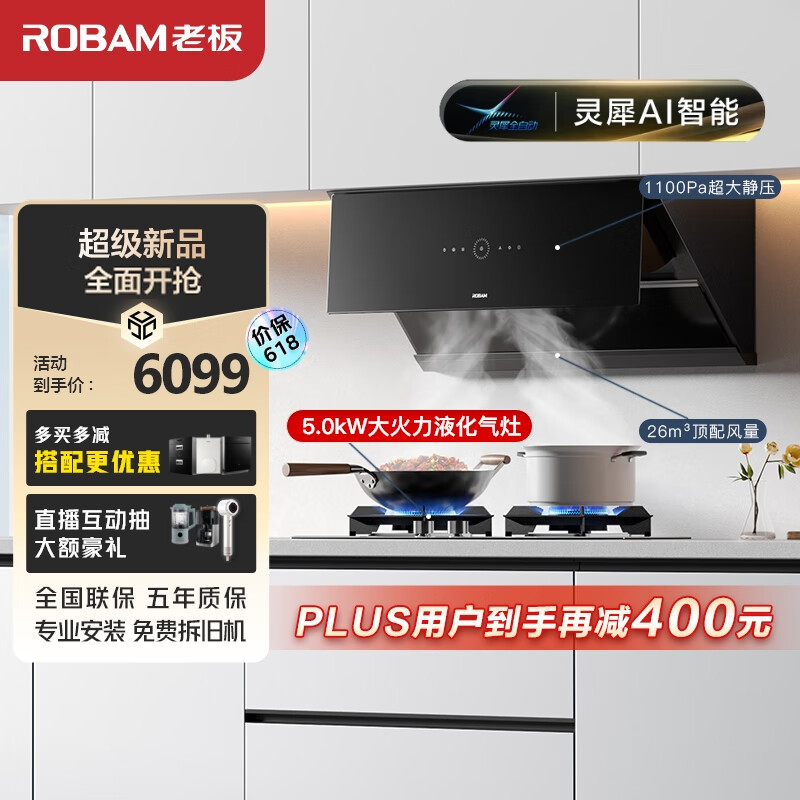 老板(Robam)【灵犀AI智能】侧吸变频26m3抽油烟机家用大吸力燃气油烟机燃气灶烟灶套装29A9S+57B2D(液化气)价格:6999.00元!