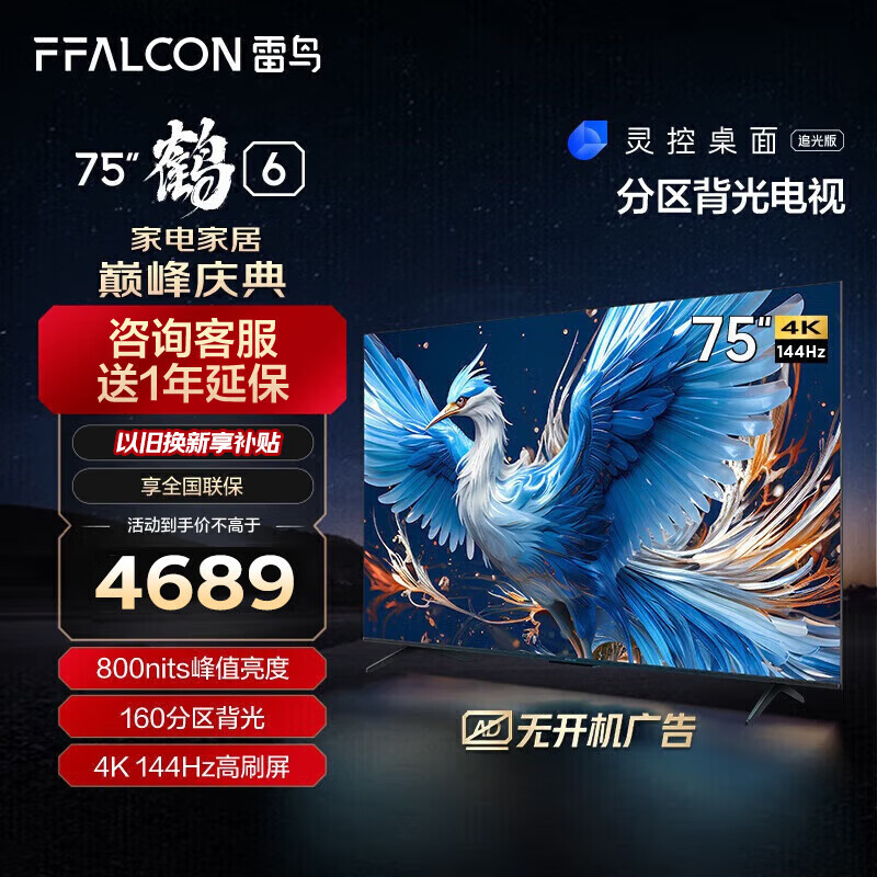 FFALCON雷鸟 鹤6 24款 75英寸游戏电视 144Hz高刷 4K 4+64GB 智能液晶平板电视机75S575C PRO[厂送]价格:4689.00元!
