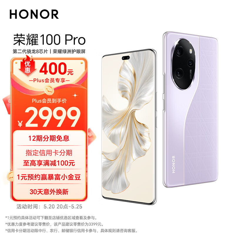 荣耀100 Pro 单反级主摄 荣耀绿洲护眼屏 第二代骁龙8旗舰芯片 AI手机 12+256 莫奈紫 5G价格:3099.00元!