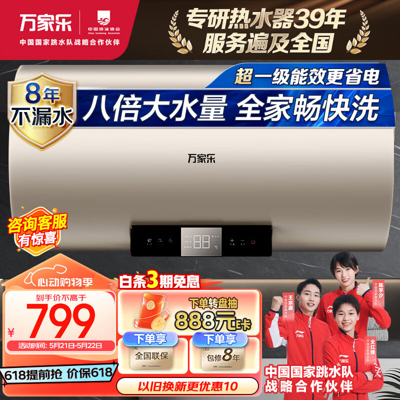 万家乐80升电热水器3000W速热大水量 一级能效 双重防电 高温杀菌 搪瓷内胆 香槟金D80-FY2价格:929.00元!