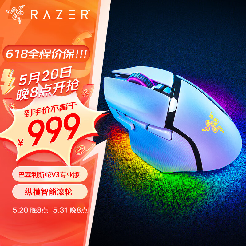 雷蛇(Razer)巴塞利斯蛇V3专业版无线鼠标 人体工学设计 RGB幻彩灯效鼠标 吃鸡/LOL/CS GO游戏 白色价格:999.00元!