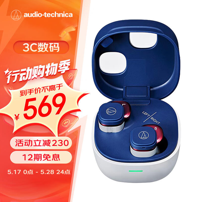 铁三角ATH-SQ1TW2 蓝牙无线耳机 真无线耳机 无线充电 IP5X*防水 海军蓝色价格:799.00元!