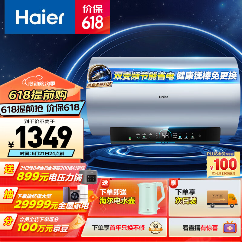 海尔(Haier)60升【金刚无缝胆】瓷净彩屏3300W大功率速热家用储水式电热水器免换镁棒增容大水量EC6002H-PD7U1价格:1499.00元!