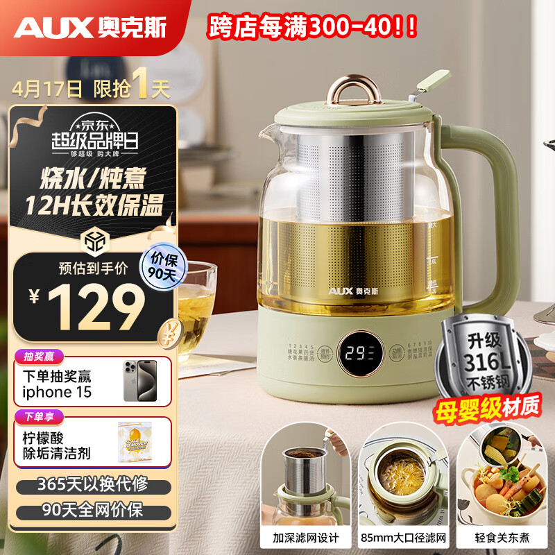 奥克斯(AUX)养生壶316L不锈钢 1.2L煮茶壶 大容量滤网茶篮 智能预约烧水壶 12小时恒温 11档控温 ASH-08A207L价格:129.00元!