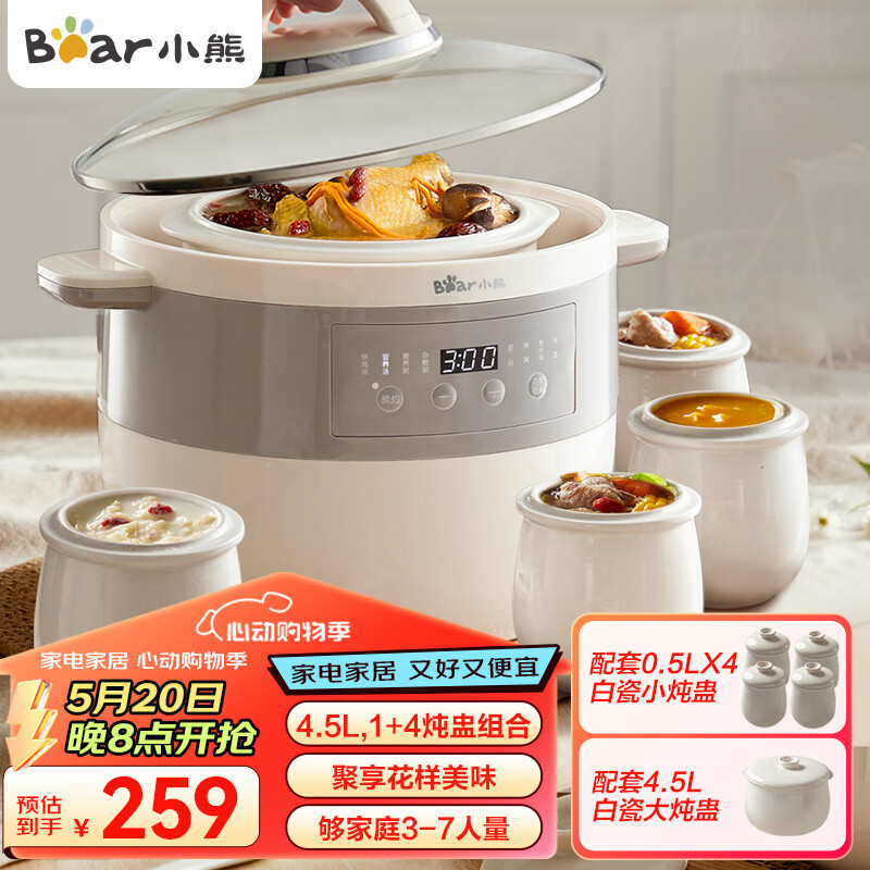 小熊(Bear) 电炖锅 炖汤锅 电炖盅 家用陶瓷锅隔水炖锅 煲汤锅熬汤煲大容量3-5人 大内胆可炖一鸡煮粥养生锅 白瓷电炖锅 4.5L价格:259.00元!