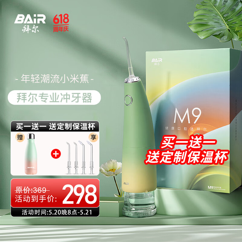 拜尔M9 小米蕉便携冲牙器 伸缩抽拉式大水箱水牙线旅行家用正畸专用口腔清洁洗牙神器 礼盒装 布蕉绿价格:298.00元!