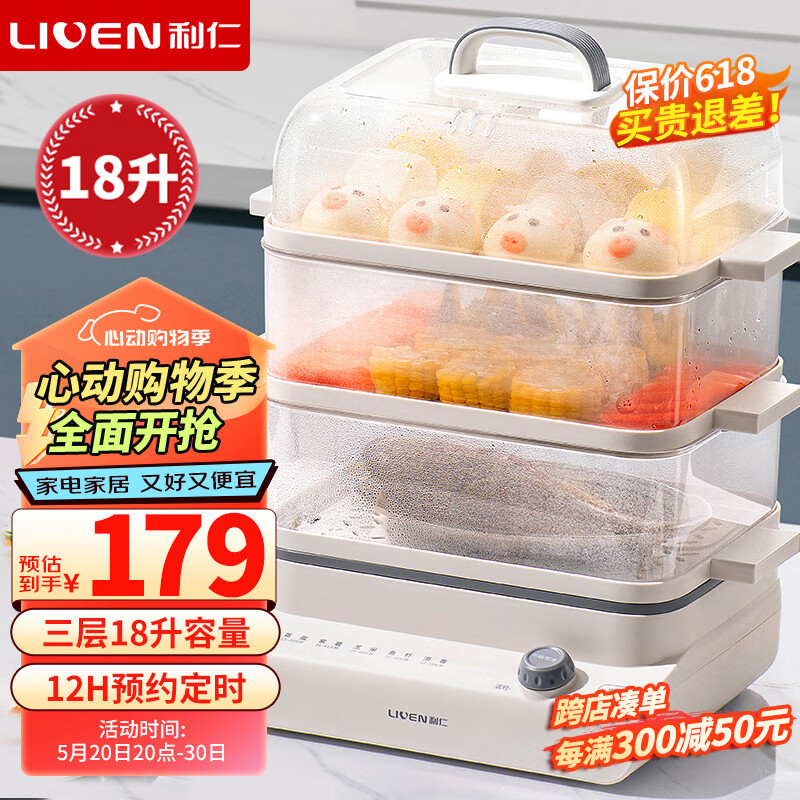利仁(Liven)电蒸锅家用多功能三层18升大容量蒸汽锅电蒸箱电蒸笼早餐包子电热煮锅可预约定时DZG-D1818价格:179.00元!