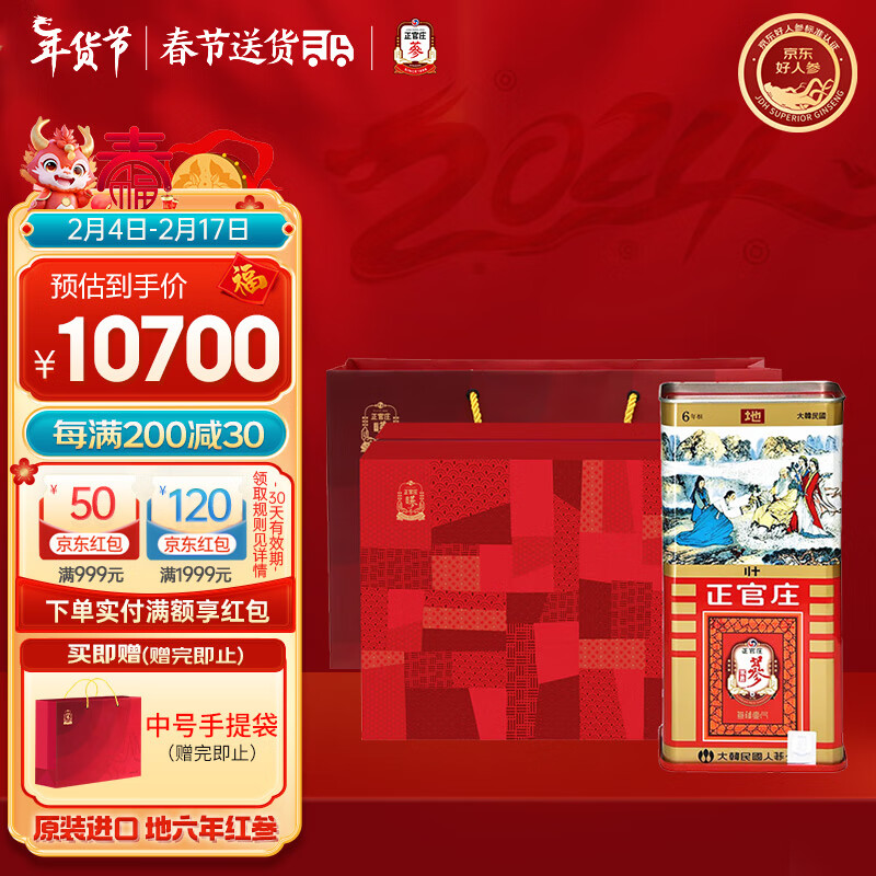 正官庄 人参 韩国原装进口 六年根高丽参 红参礼盒[地字]20支600g(约28根参)皂苷年货春节健康滋补礼品补品价格:11800.00元!