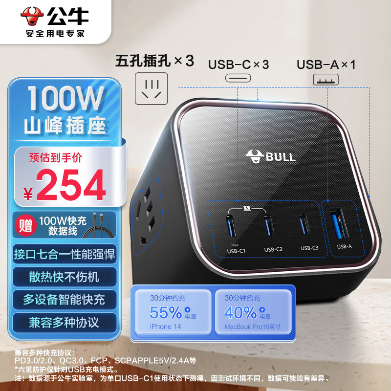 公牛(BULL)氮化镓100W快充笔记本多功能插座/插线板/插排/接线板 USB(3C1A)+3插孔 全长1.5米 GNV-MS1103价格:259.00元!