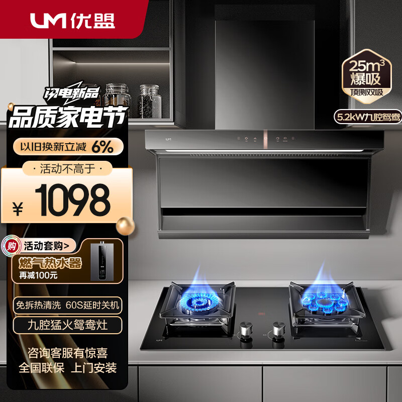 优盟(UM)油烟机顶侧双吸7字型抽油烟机灶具套装 家用大吸力自动清洗25立方吸油烟机燃气灶烟灶套装 天然气价格:1398.00元!