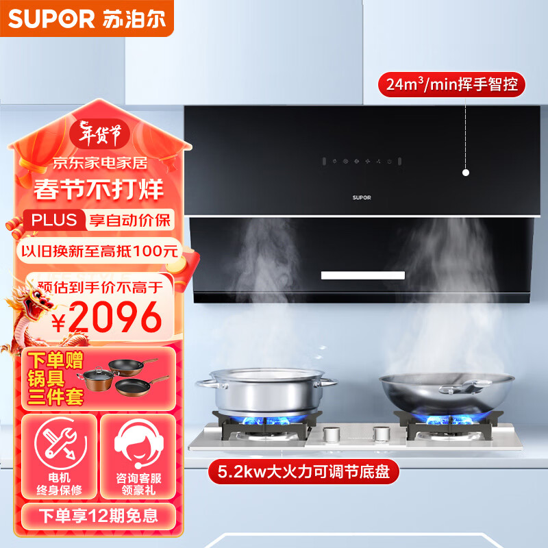 苏泊尔(SUPOR)抽油烟机燃气灶套装 24立方侧吸式烟灶套装 900Pa变频风压挥手智旋干洗吸油烟机DJ36+DS35天然气价格:2096.00元!