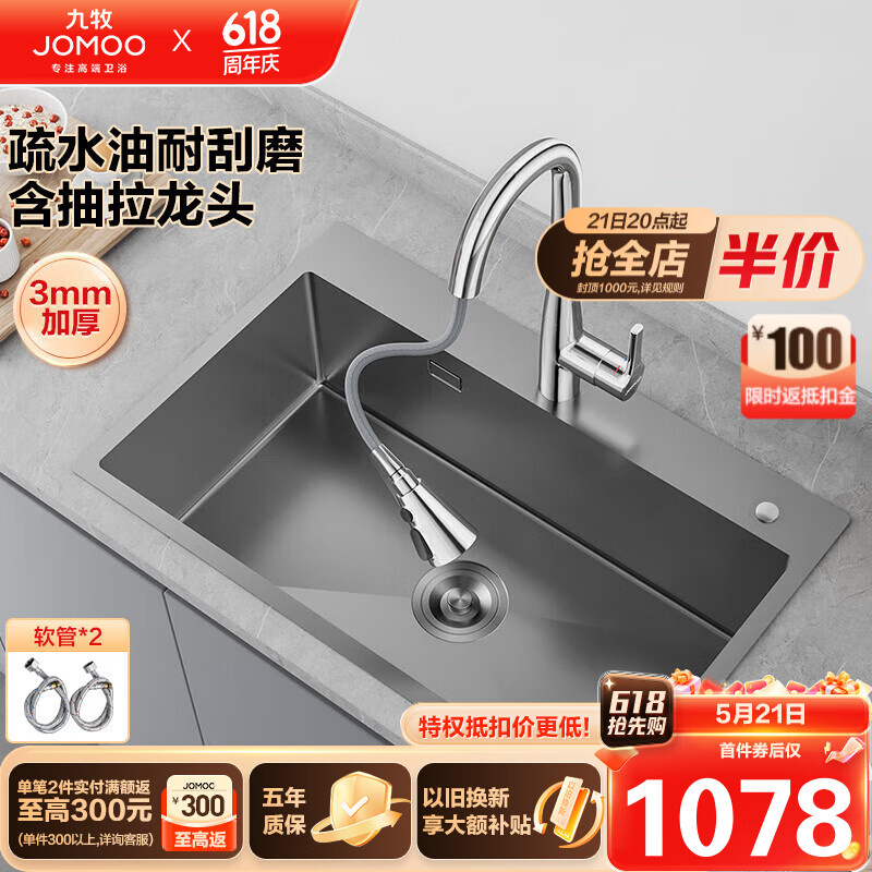 九牧(JOMOO)不锈钢手工水槽大单槽厨房洗菜盆单槽洗碗池70*45(含龙头)02264价格:1338.00元!