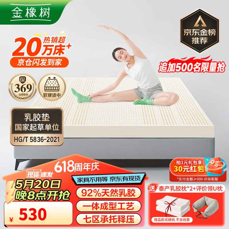 金橡树泰国乳胶原液进口床垫榻榻米单人床垫 1.2米 泰舒 含内外套价格:530.00元!