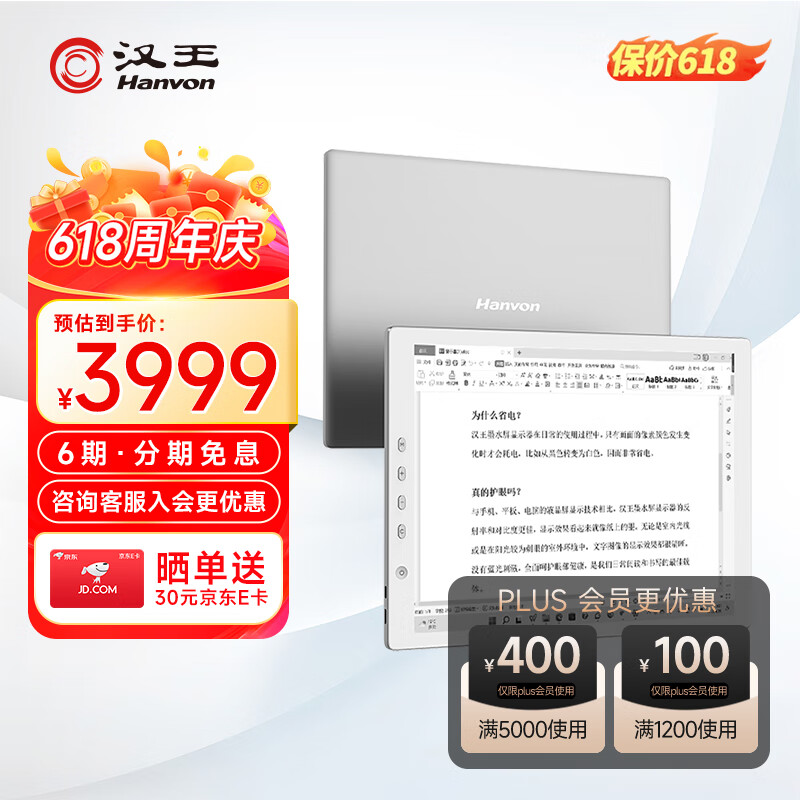 汉王(Hanvon)13.3英寸大屏电子便携式轻薄墨水屏显示器显示屏 智能阅读学习办公电子纸电纸书套装 HDMI接口价格:3999.00元!