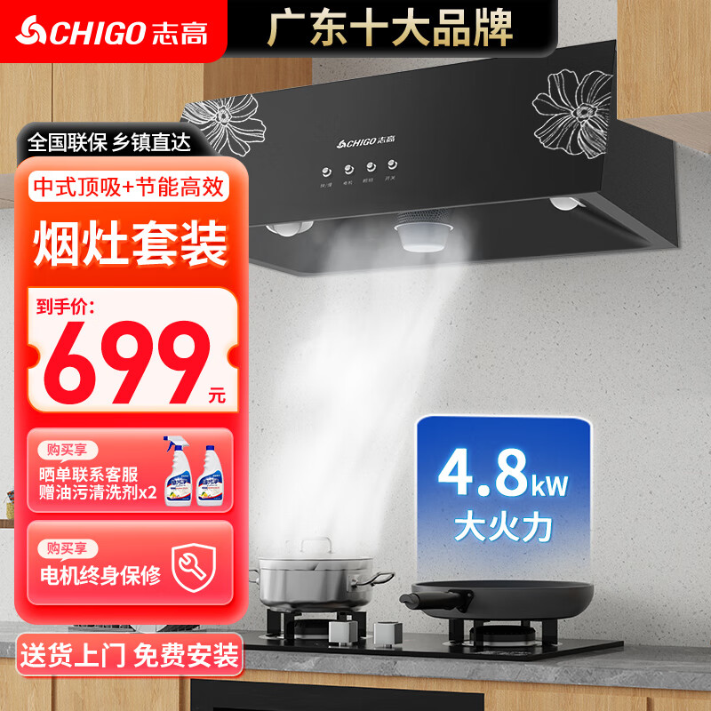 志高(CHIGO)油烟机家用抽油烟机出租房小尺寸顶吸脱排烟机中式厨房大吸力烟灶套装CXW-200-AX06+ JZT-T130A价格:759.00元!