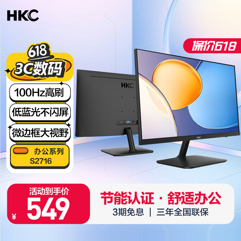 HKC 27英寸 IPS面板 100Hz高清屏幕 低蓝光不闪屏 HDMI接口节能认证 办公电竞游戏电脑显示器 S2716价格:729.00元!