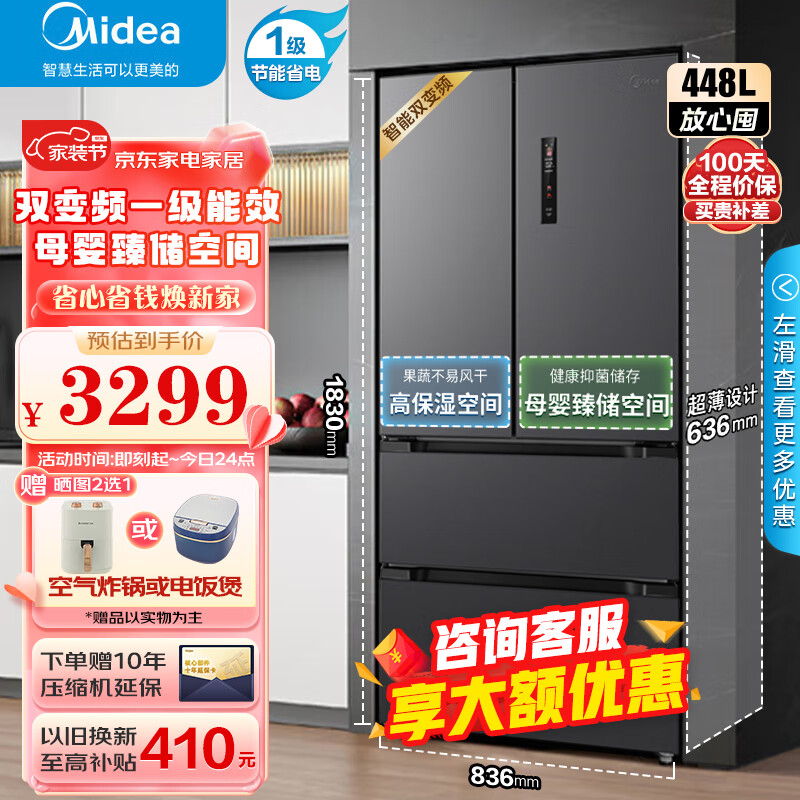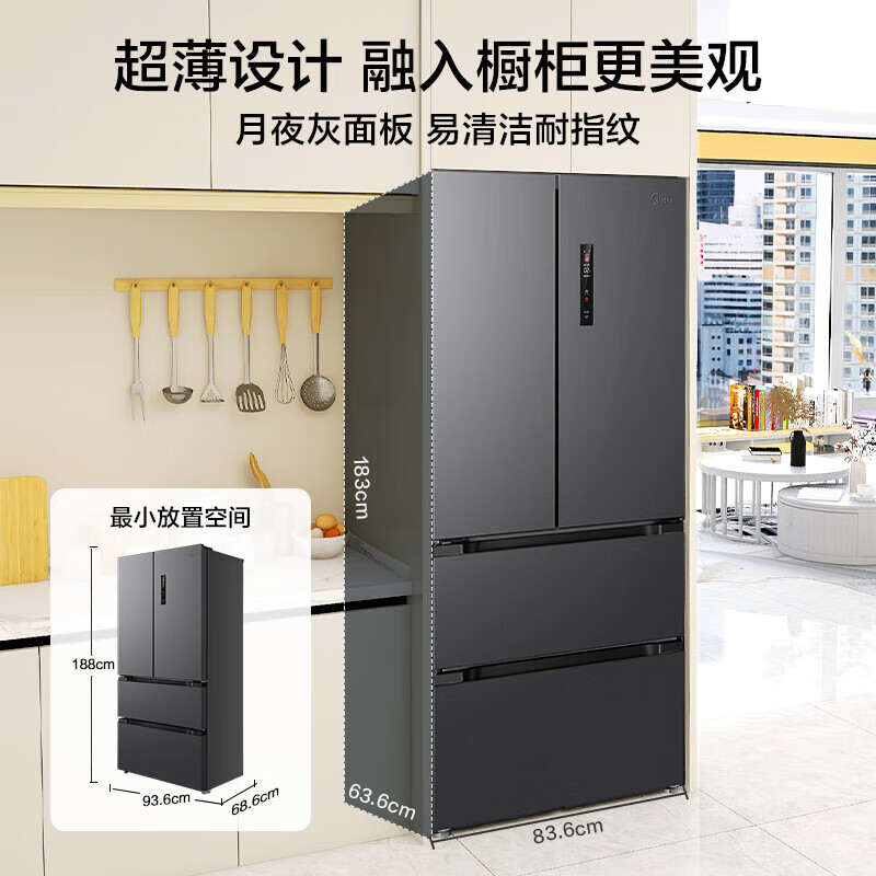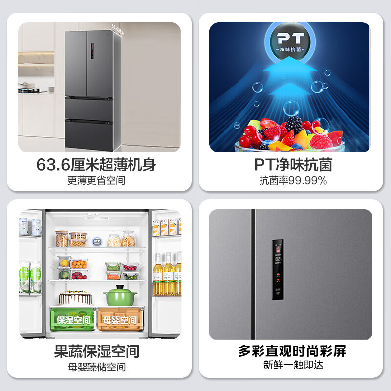美的(Midea)470变频一级能效节能法式四开门多门超薄母婴冰箱风冷无霜除菌净味大容量家用电冰箱MR-470WFPZE价格:3499.00元!
