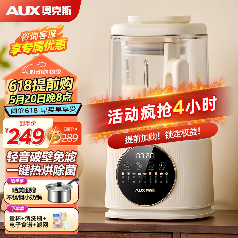奥克斯(AUX)柔音破壁机家用免滤豆浆机全自动多功能榨汁机辅食机搅拌机早餐机一键预约热烘干防糊底HX-PB9782Z价格:249.00元!