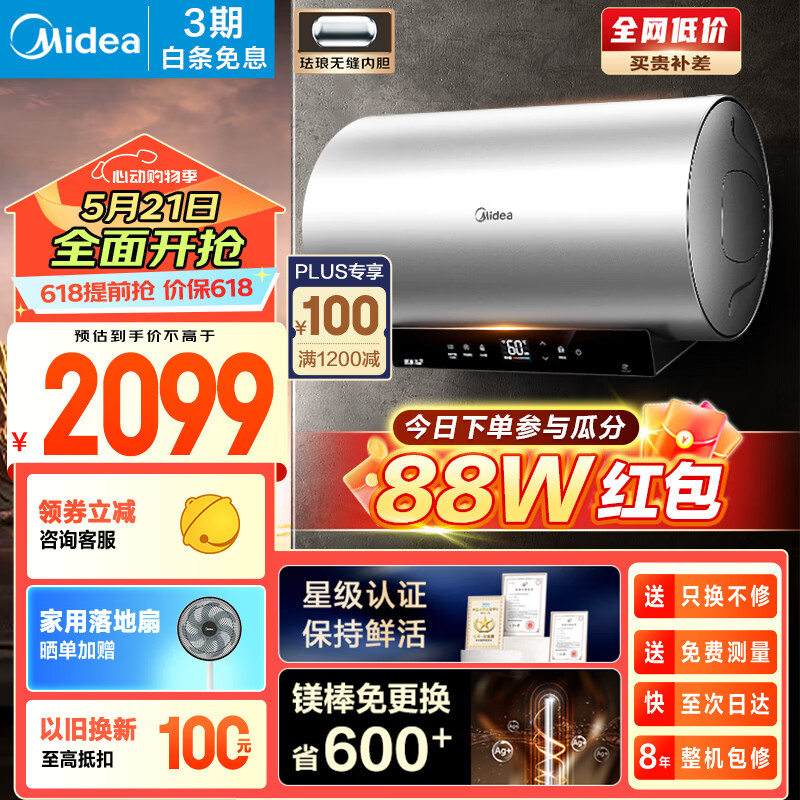 美的(Midea)专利TECH活水系列60升电热水器 免换镁棒储水式3300W一级能效节能智能7星认证云管家F6033-HQ(HE)价格:1982.30元!