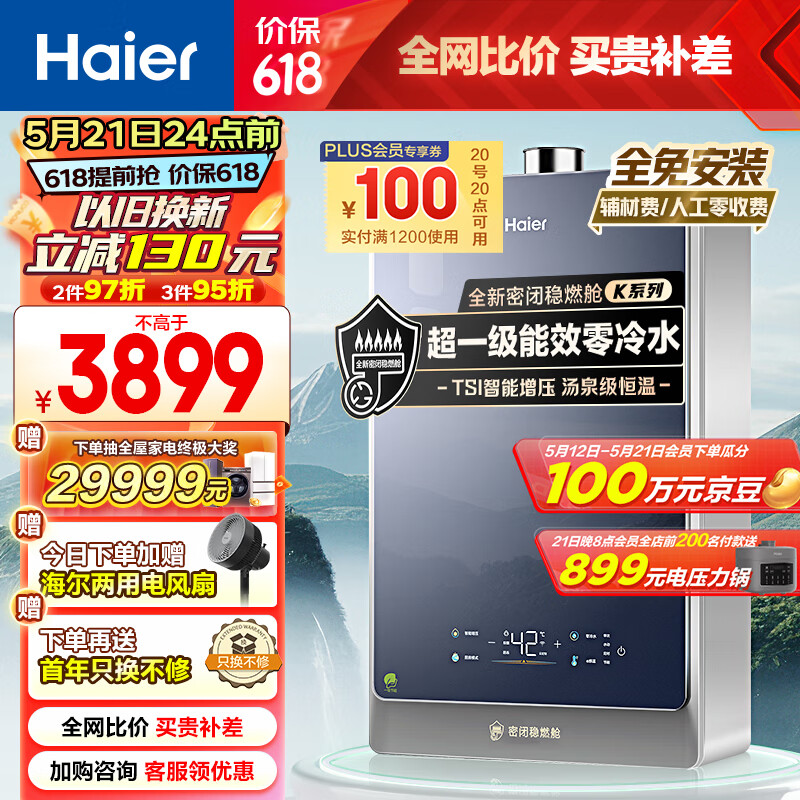 海尔(Haier)16升【K系列KLN】燃气热水器天然气 超一级能效 无级变频水伺服 TSI增压 JSLQ27-16KLN-ECO7FLRGU1价格:4399.00元!