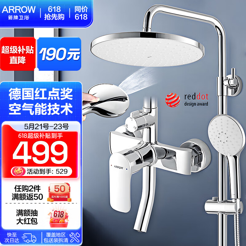 箭牌(ARROW)淋浴花洒套装 自洁淋浴喷头升级下出水 洗澡沐浴易洁手持顶喷 红点奖背喷花洒3354MS-P价格:629.00元!
