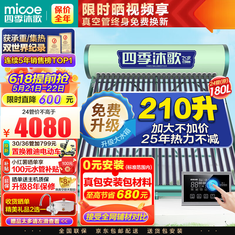 四季沐歌(MICOE)飞享太阳能热水器家用光电两用自动上水 带电加热 水温水位显示 6分独立双管口24管180L送货+安装价格:4680.00元!