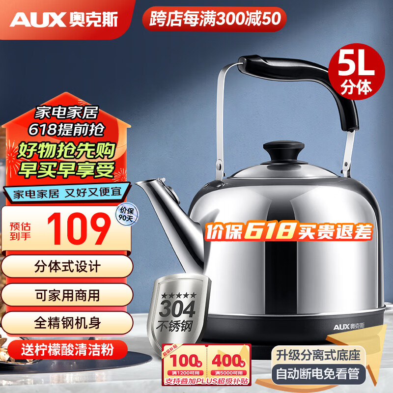 奥克斯(AUX)电水壶热水壶电热水壶304不锈钢5L大容量暖水壶烧水壶煲开水壶商用家用智能自动断电 AK-15N53价格:109.00元!