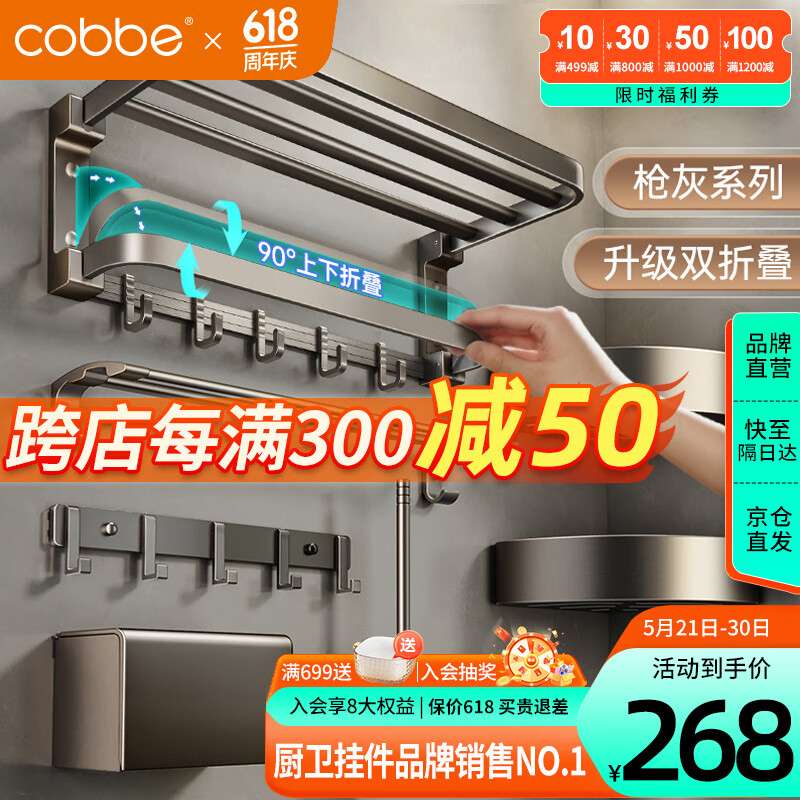 卡贝(cobbe)浴室太空铝毛巾架免打孔卫生间置物架厕所浴巾架卫浴五金挂件套装价格:268.00元!