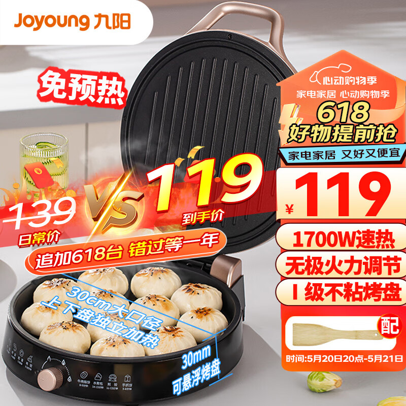 九阳(Joyoung)家用电饼铛火力可调煎烤机烙饼机双面加热1700大火力早餐机加深盘JK-30K09升级价格:119.00元!